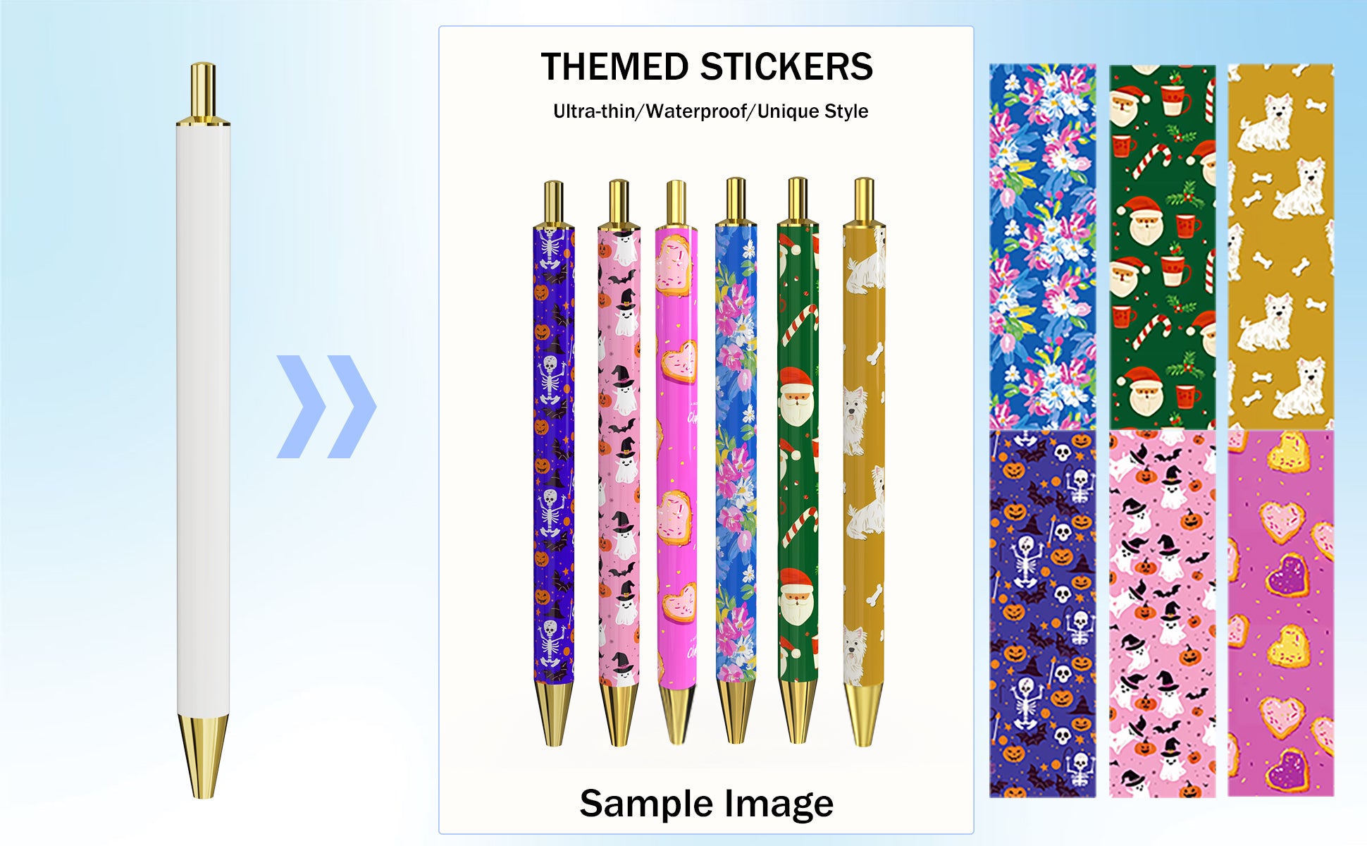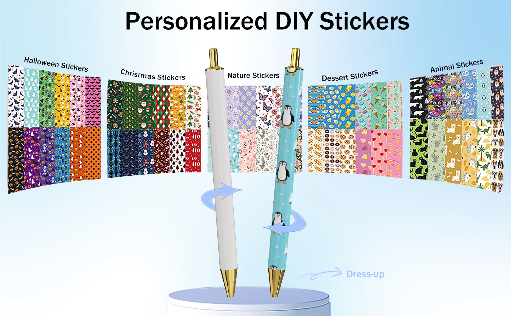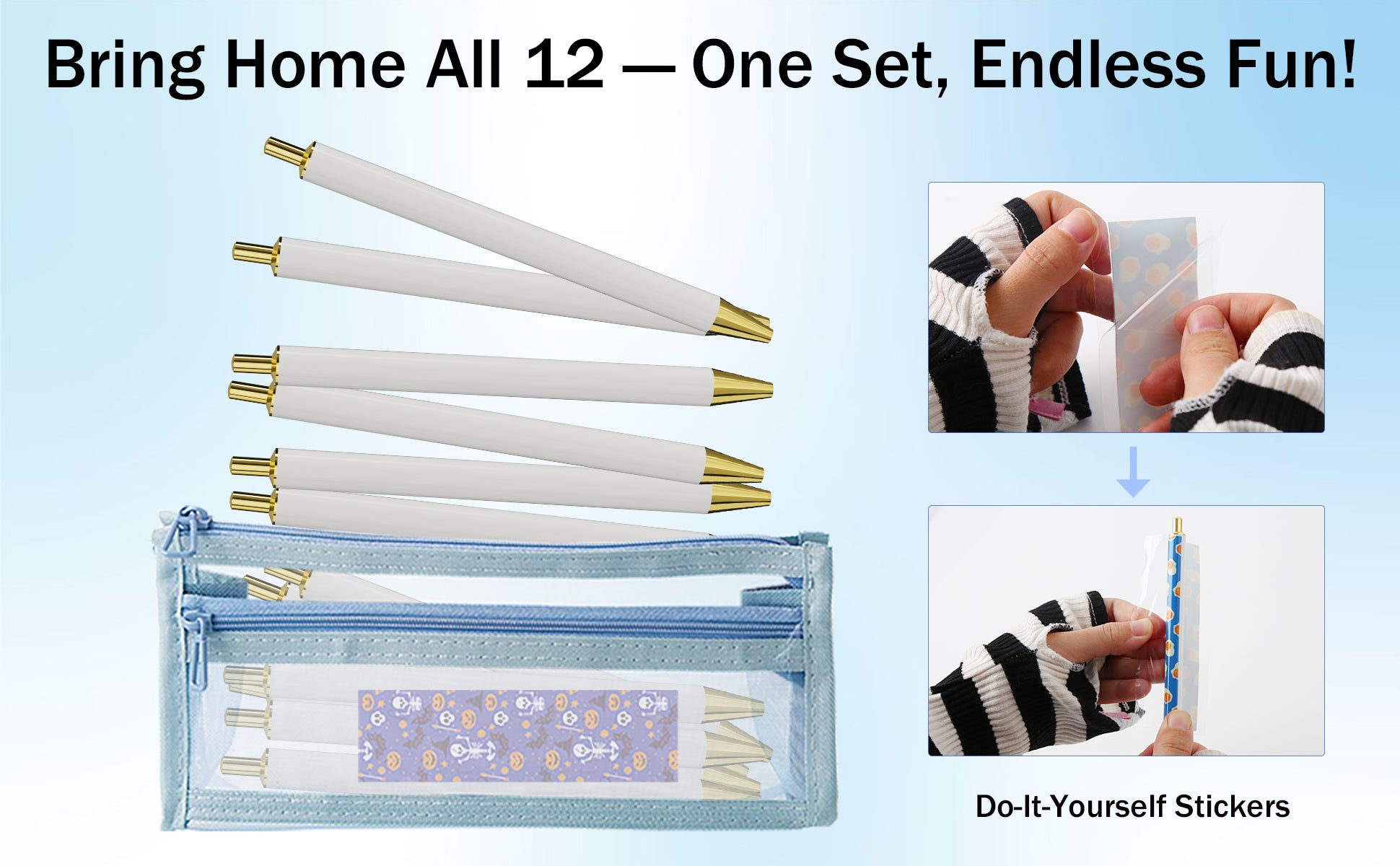 Rarler 12 Blank Click Ballpoint Pens with Blue Transparent Mesh Pencil Case, 12 Theme Stickers for DIY, Gold Tip and Cap, School Office Stationery Supplies (12 Pack)