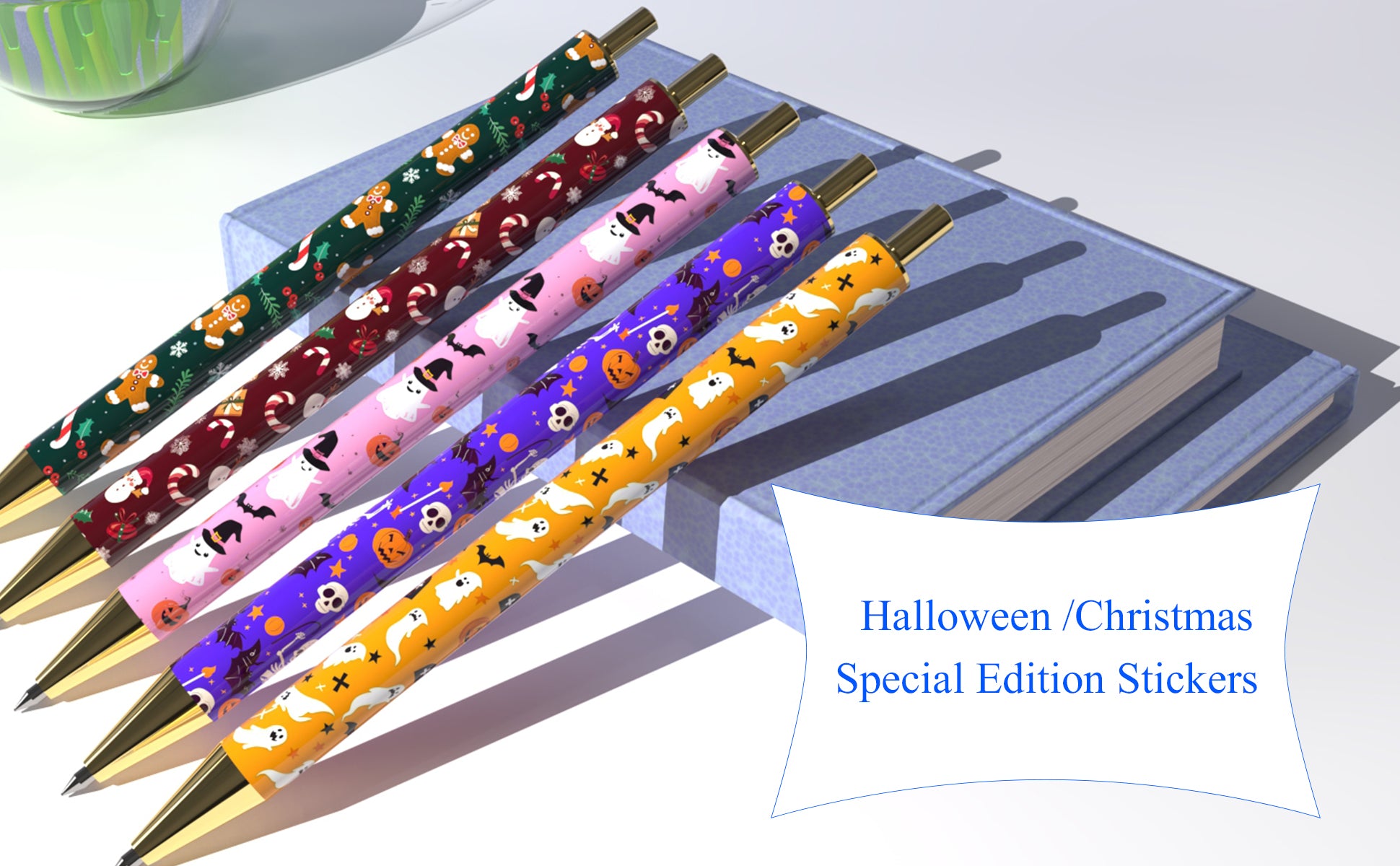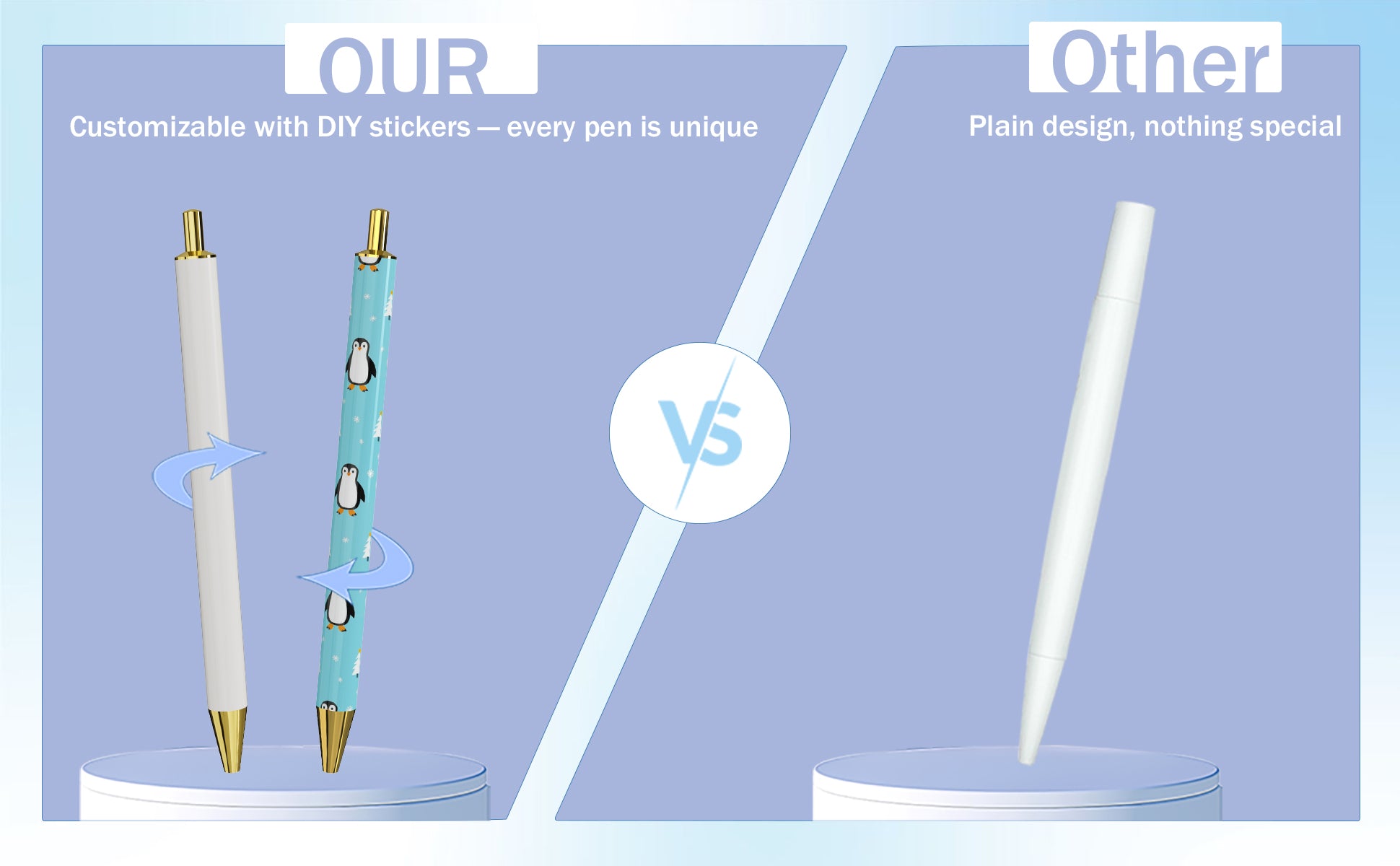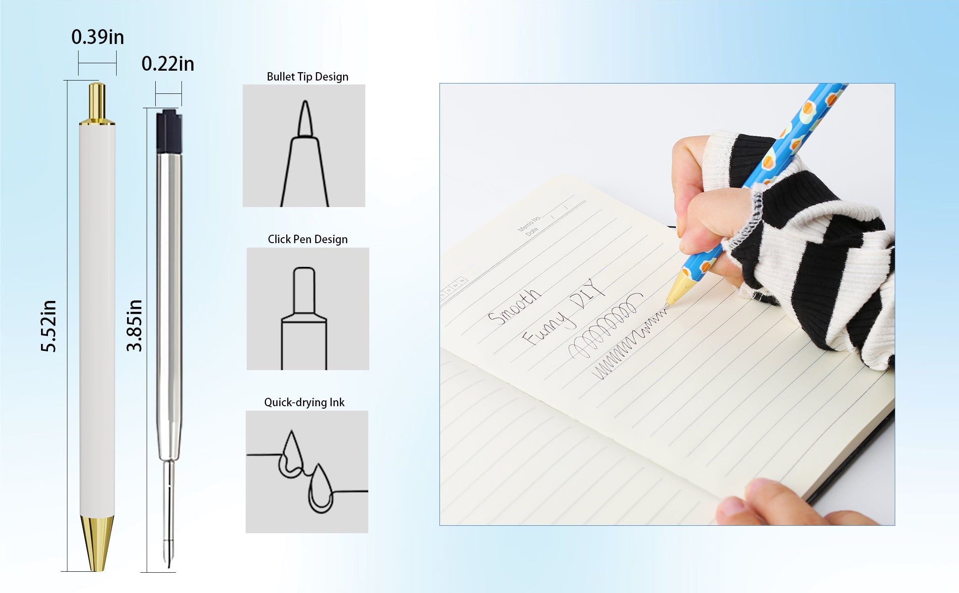 Rarler 12 Blank Click Ballpoint Pens with Blue Transparent Mesh Pencil Case, 12 Theme Stickers for DIY, Gold Tip and Cap, School Office Stationery Supplies (12 Pack)